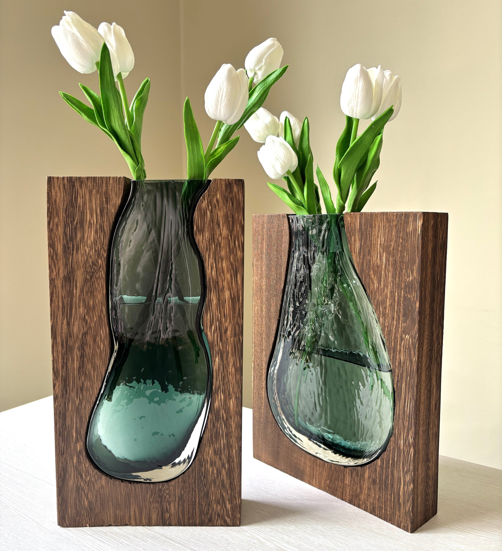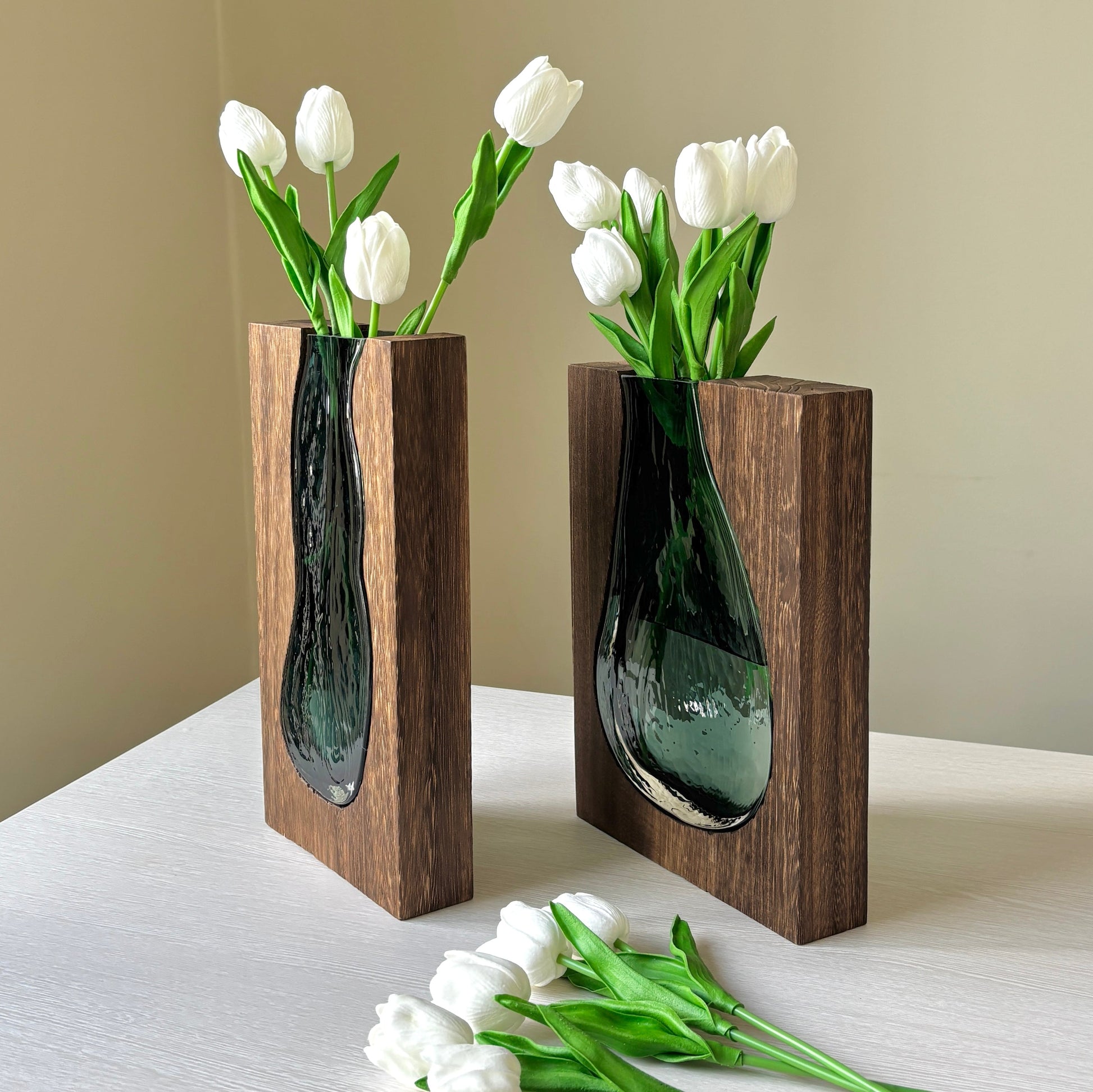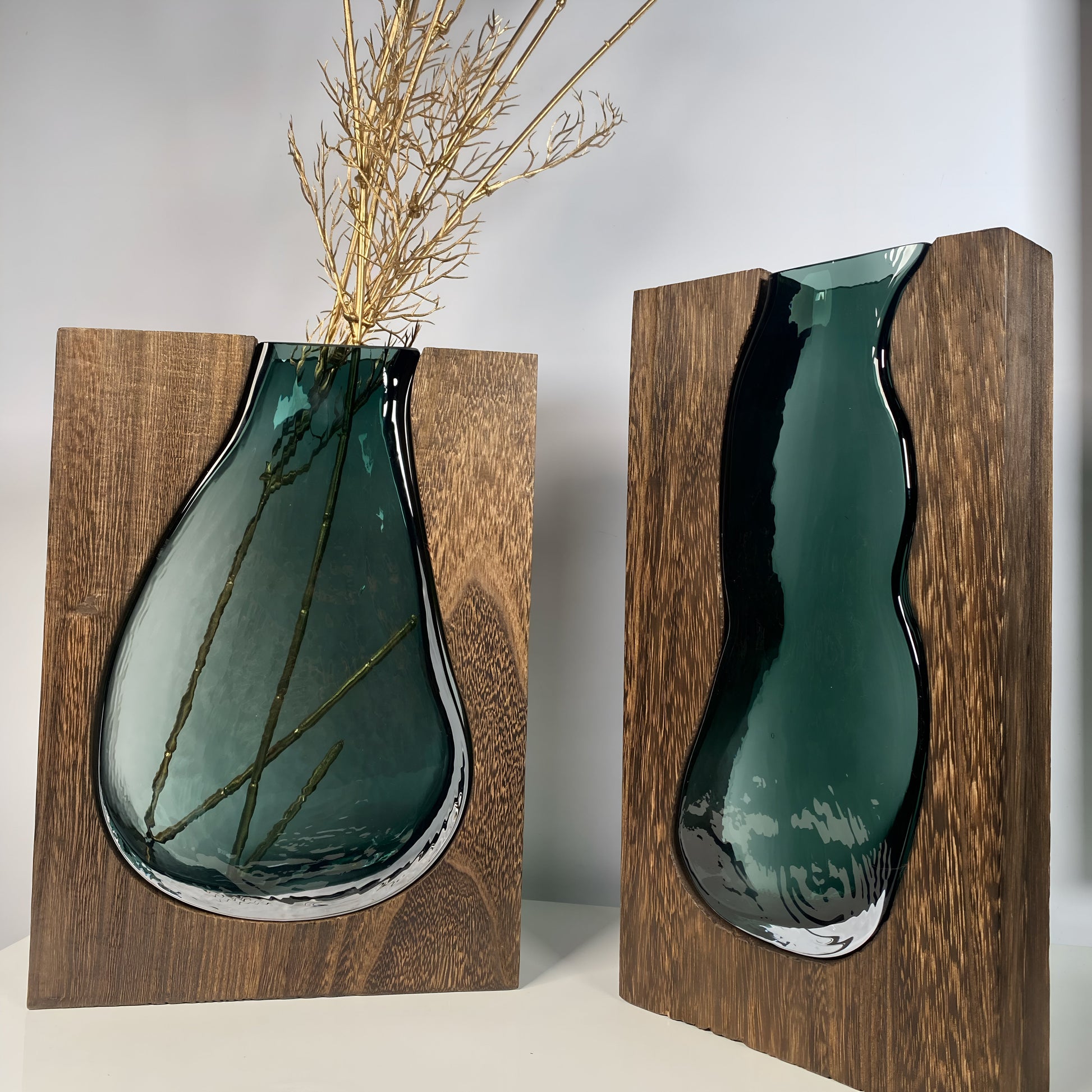 En vas med ett dekorativt mönster som för in en härlig stämning i ditt hem. Unik blandning av trä och glas som framhäver elegans och exklusivitet. Det går att designa vasen med några väl valda blommor. Passa på och köp denna fina vas innan det är försent!