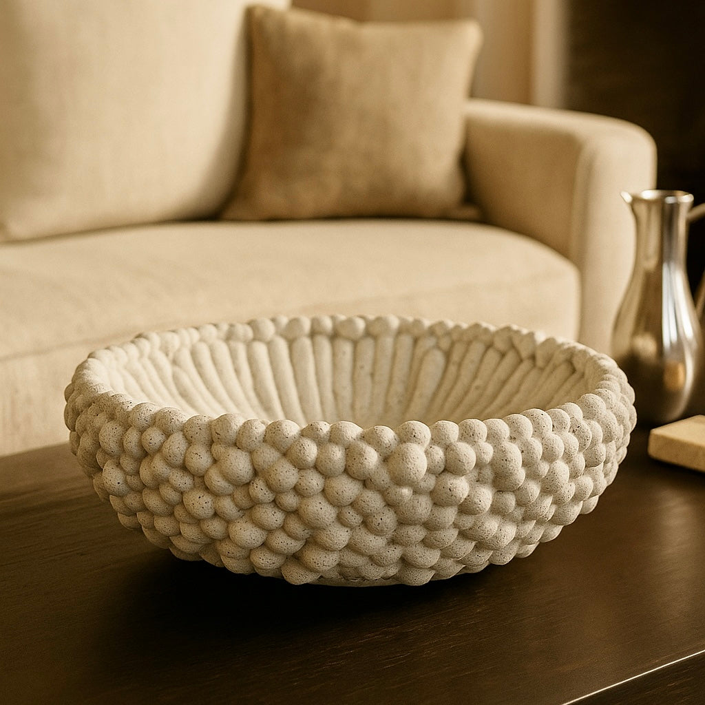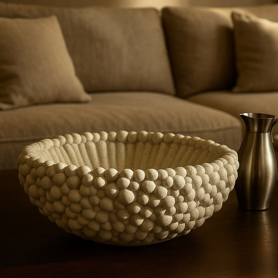 Vello fat är ett konstnärligt utformat fat med unik textur som för tankarna till naturens former. Den eleganta designen gör fatet till en iögonfallande detalj i hemmet – perfekt för servering, dekoration eller som ett exklusivt blickfång i vardagsrummet.